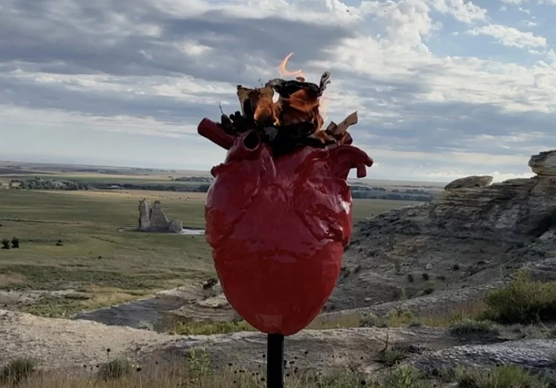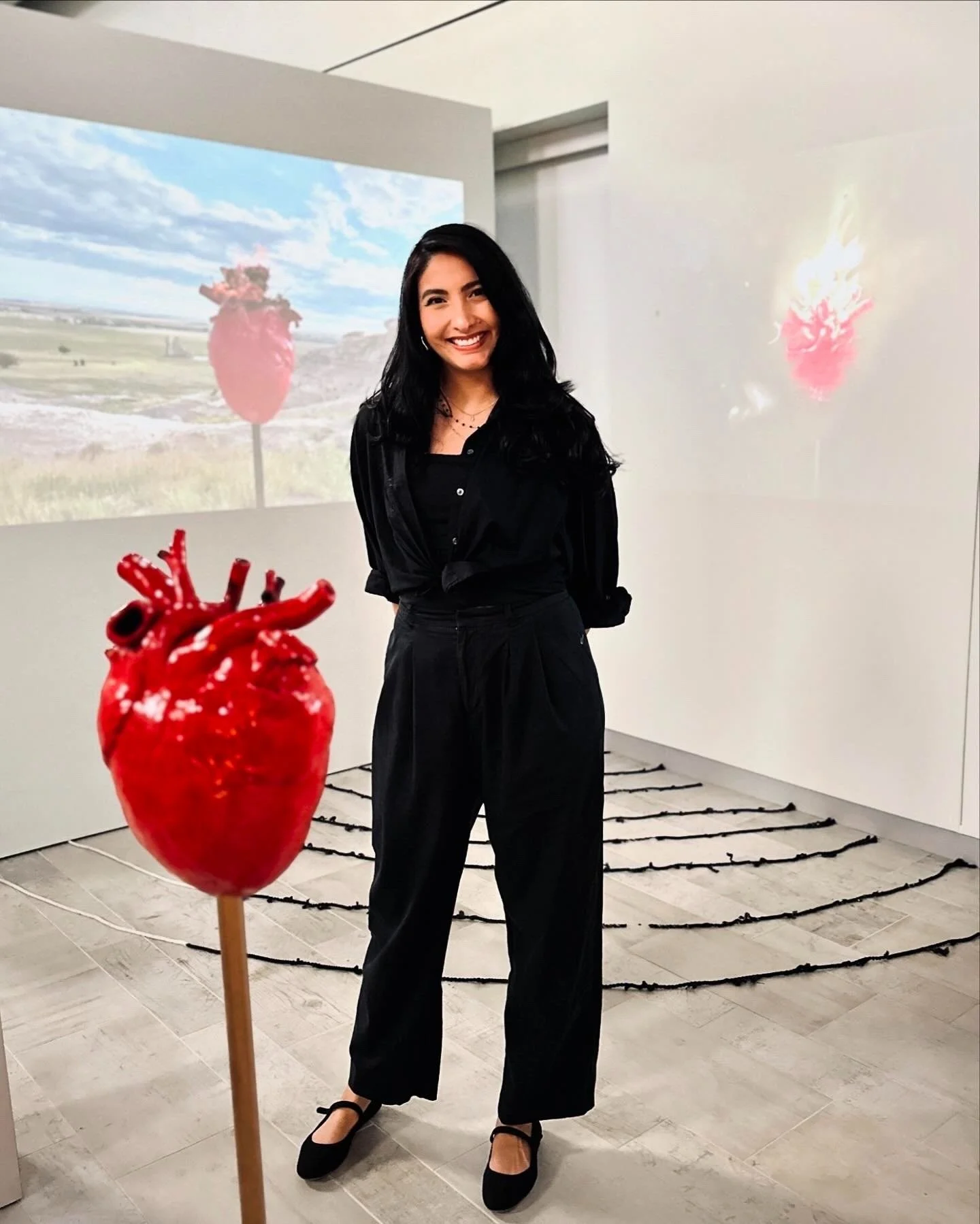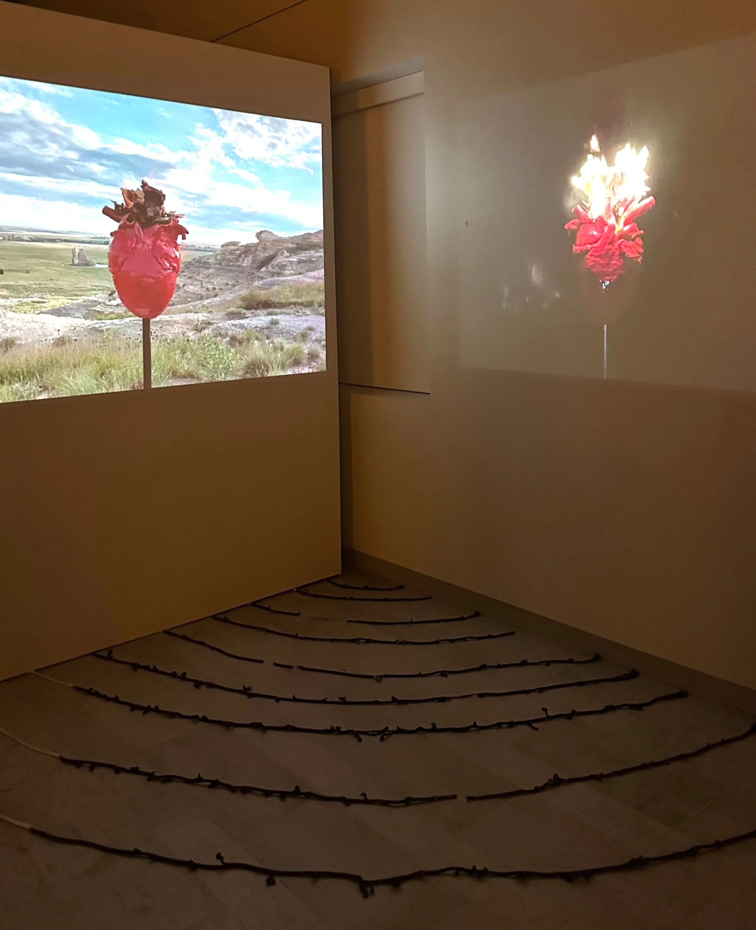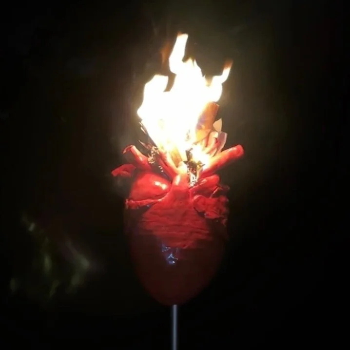 This installation features two burning hearts projected in different directions. One heart, burning in the night, symbolizes the past, while the other, shining in the day, represents the present. Between them lie progressively charred cords and their ashes signifying the severed ties with the past, whether voluntarily or involuntarily. The heart at night continues to burn in the background as a reminder of what we’ve left behind or what has left us behind. This installation explores the tension between embracing change and holding onto the past, inviting viewers to reflect on the sacrifices and transformations that accompany personal growth.